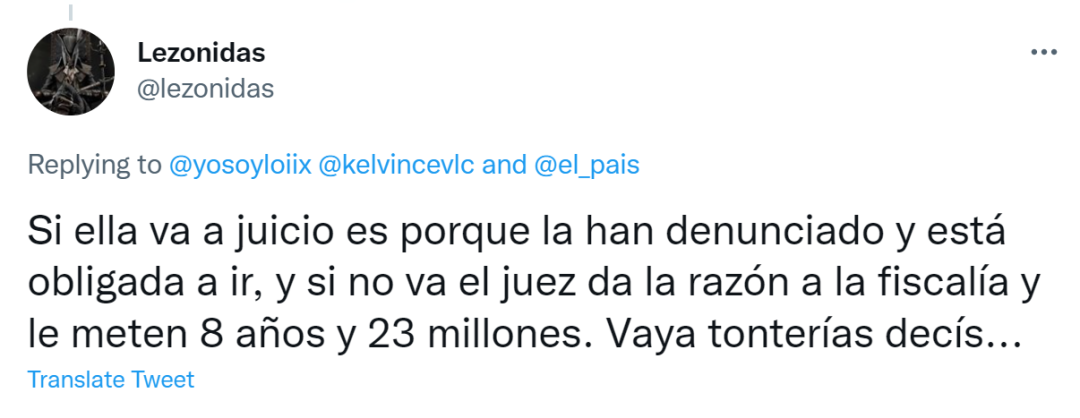 另外一位网友则回复到:“她出席庭审,是因为他们告发了她并且她必须去,如果她不去,法官将会站在检方那一边,夏奇拉会被判八年还有2300万的罚款。你说什么胡话呢……”