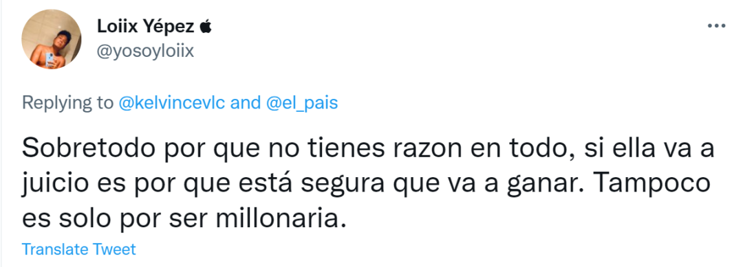 有网友则反对上面的观点:“实际上是因为你根本说的不对,如果她出席审判,那是因为她确信自己会赢。这也不仅仅因为是她是百万富翁。”