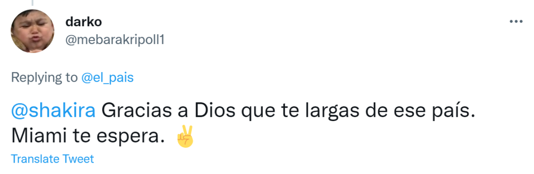“@shakira 感谢上帝,你快离开那个国家吧,迈阿密在等着你 ✌️”