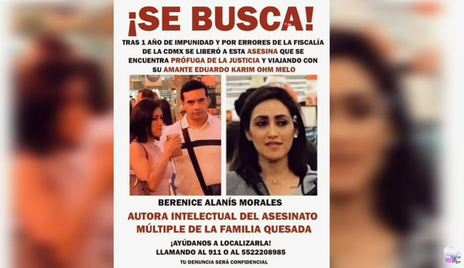 7月20日,墨西哥警方在格雷罗州(Guerrero)的阿卡普尔科港(El puerto de Acapulco)逮捕了一位名叫贝伦妮丝·阿拉尼斯(Berenice Alanís)的女子。她曾雇杀手将自己丈夫雅各布·克萨达(Jacobo Quesada)及其两个二十多岁的子女:小雅各布和帕特里夏(Jacobo Jr. y Patricia)杀害,从而独吞约达四亿墨西哥比索(共计约1.32亿人民币)的家产。她毒辣且狠绝的手段和方式,被媒体称为“墨西哥黑寡妇(Viuda Negra Mexicana)”。