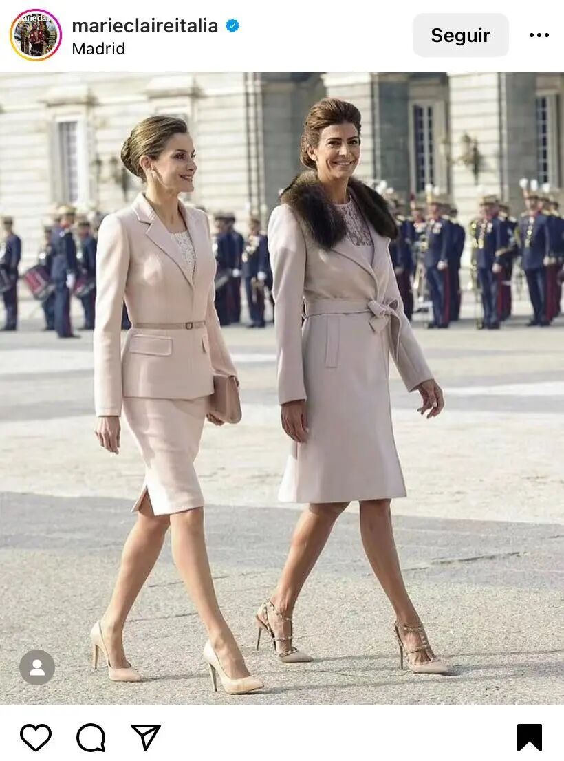 Cuando el presidente argentino Mauricio Macri y su mujer Juliana Awada visitaron Madrid en febrero de 2017, una imagen acaparó todas las portadas y titulares. La reina Letizia y Awada, mano a mano, caminando por el patio del Palacio Real con estilismos tan similiares, ambas en tonos empolvados y cortes rectos, que parecían haberse puesto de acuerdo.2017年二月,时任阿根廷总统的Mauricio Macri和他的妻子Juliana Awada访问马德里时,一张图片抢占了所有头版和头条。Letizia王后和Awada手拉手走过王宫庭院,两人的装扮十分相似,好像是提前商议好的。