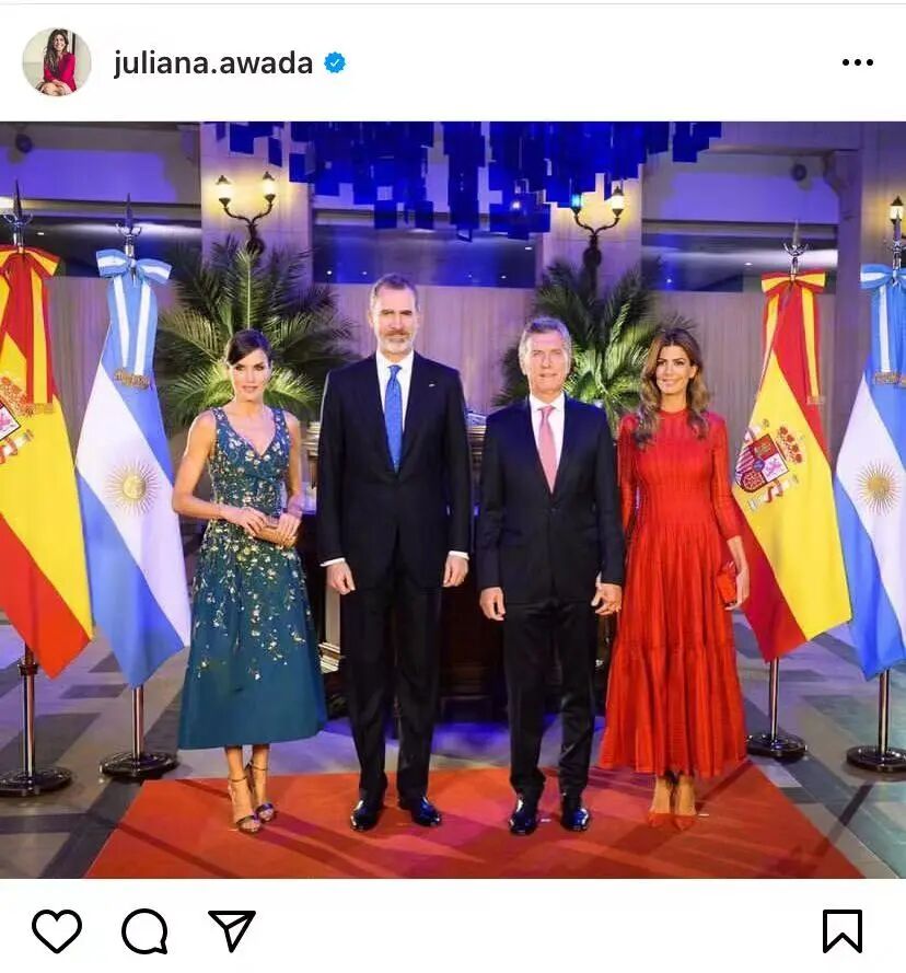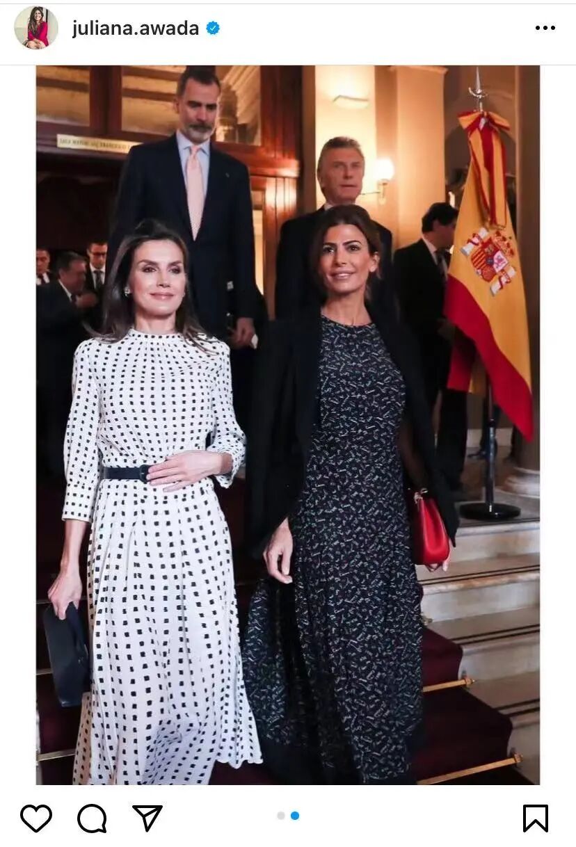 Cuando los reyes devolvieron la visita a la pareja presidencial y viajaron a Buenos Aires, una vez más Letizia y Awada volvieron a demostrar la bueno sintonía entre ellas.当西班牙国王和王后回访阿根廷时,Awada和Letizia王后又一次展现出了惊人的默契。两人同样穿了飘逸的印花长裙,只不过图案有点不一样。