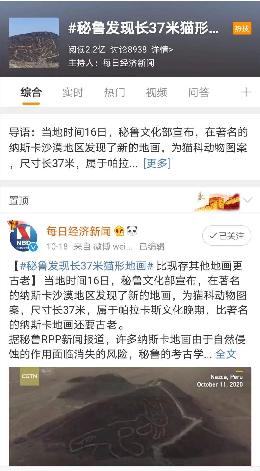 当地时间10月16日,在秘鲁南部的纳斯卡沙漠地区发现了新的地画,图案形似猫科动物。经考证,此地画比之前已经发现的一众纳斯卡地画还要古老,这一新发现在考古学界引起高度关注。