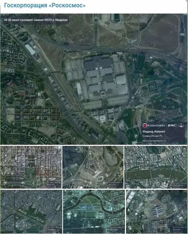俄国家航天集团公司这7张卫星图分别展示的是:马德里展览中心的会议中心、美国白宫、五角大楼、英国国防部、德国国会大厦和联邦总理府、法国巴黎的香榭丽舍大街和爱丽舍宫、比利时布鲁塞尔的北约总部大楼。