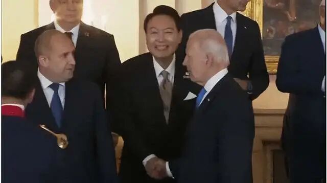 晚宴当天,让尹锡悦尴尬的是不止这一件。在北约峰会参与国领导人大合照环节,尹锡悦满心欢喜地看向走来的美国总统拜登,结果拜登与尹锡悦短暂握了一下手就转向保加利亚总统拉德夫,尹锡悦的笑脸只等来了拜登的“走过场”。