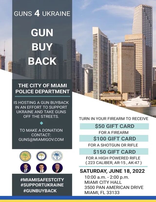 迈阿密市长弗朗西斯·苏亚雷斯为解决美国枪支暴力这个大麻烦,想出了个“绝妙办法”——迈阿密将无条件回购民众手中的枪支送给乌克兰——枪支暴力严重,美国不需要枪,那就让它们去需要枪的地方。