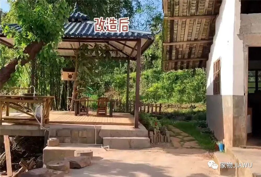 与此同时,这位小哥还在庭院的平台上搭起了小亭子,下面放上一张小桌、几把椅子,可以坐在这里静静品茶、感受田园生活的美好。