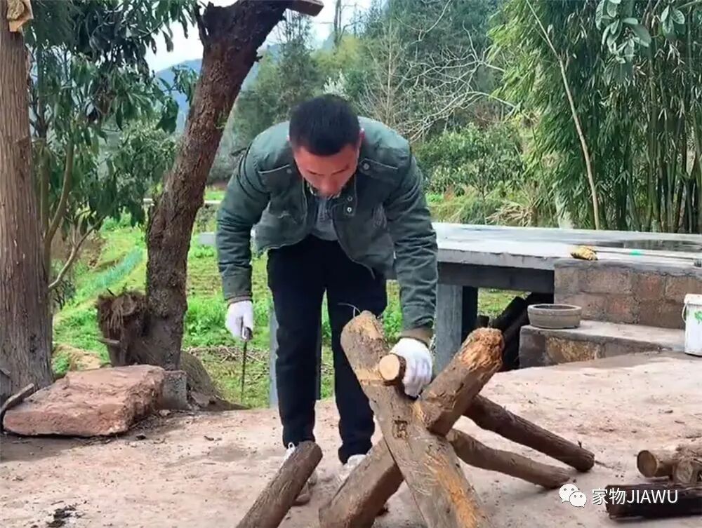 同样地,这位小哥还是自己找来锯和木头,自己动手削尖,当做篱笆墙的桩子。
