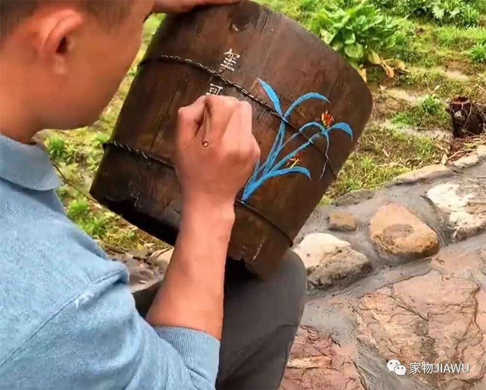 没想到的是这位小哥书法绘画手艺也不错,找来废旧的木桶,在上面手绘上字和画,可以说是变废为宝了。