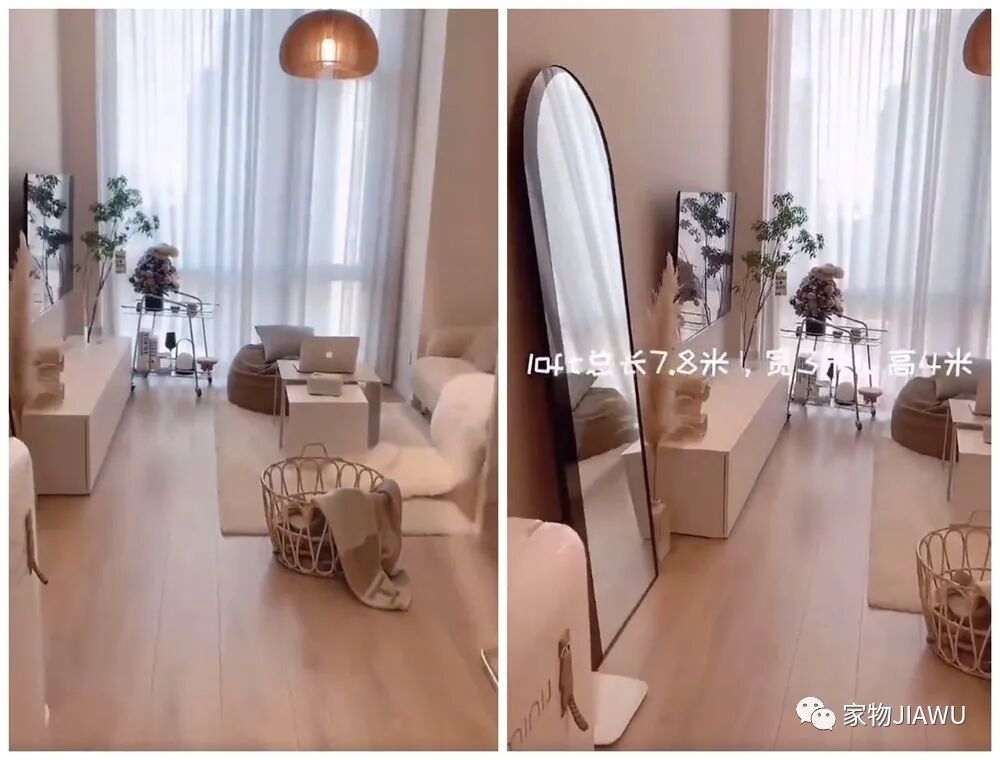 房间内总长7.8米,宽3米,再加上高高的采光大窗,让客厅看上去其实还算宽敞、豁亮。