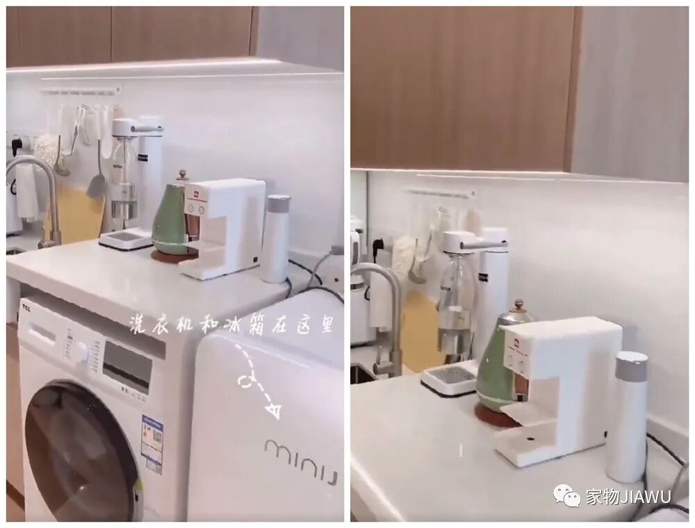 橱柜旁边嵌入了洗衣机,同时在洗衣机上方增加柜板,将厨房做成高低台的感觉,上面放置咖啡机、电热水壶,打造出小小的水吧区域,提升厨房的多用性。
