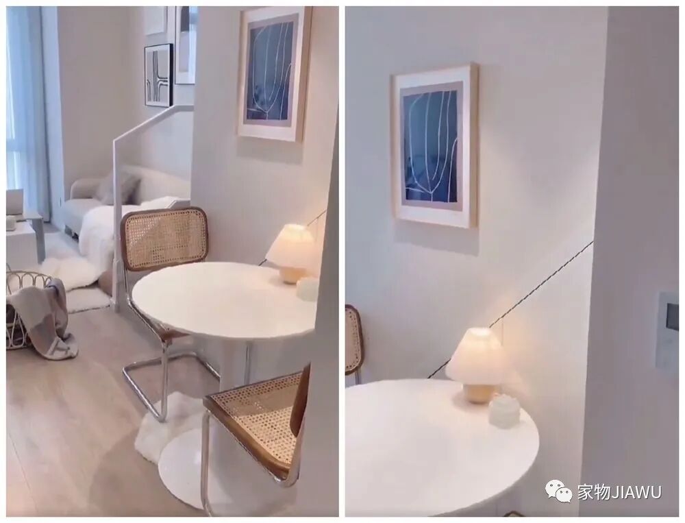 说是“客餐厅一体化”设计,但其实进门右手边的小餐桌,就是一张两人位的圆桌,为这位独居的姑娘提供用餐、工作、喝下午茶的空间,同时也完美点缀了楼梯间的空白区域。