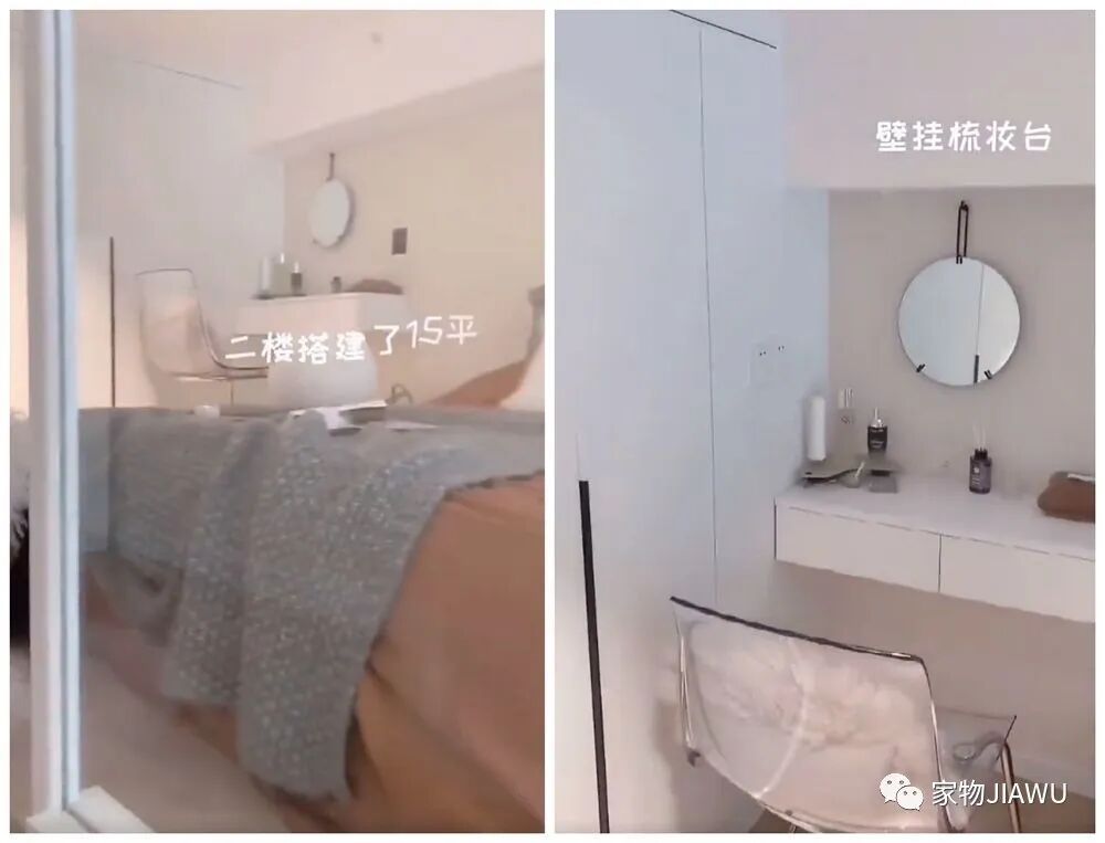 在床头和衣柜的夹角中,姑娘还做了一个小小的化妆区,桌面刚好代替床头柜的功能。