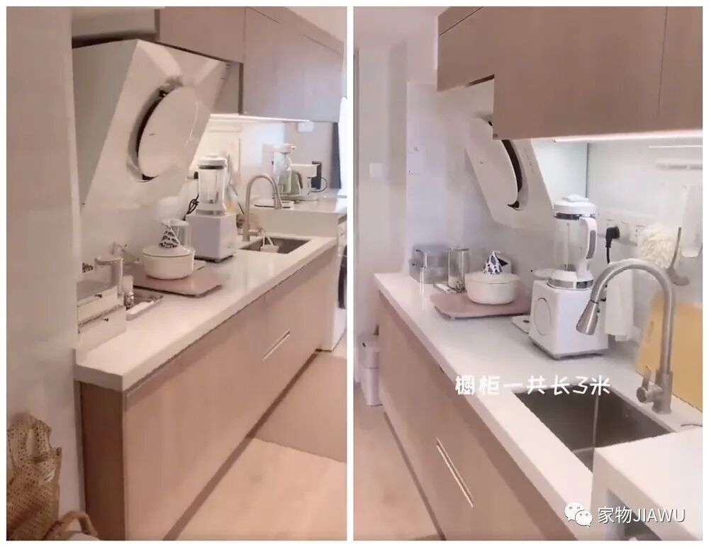 别看开放式厨房的面积同样很小,橱柜只有3米长,但还是容纳下了水槽、油烟机、电磁炉灶台等一系列必备厨电,平日里姑娘自己做些简单的饭菜还是轻轻松松的。