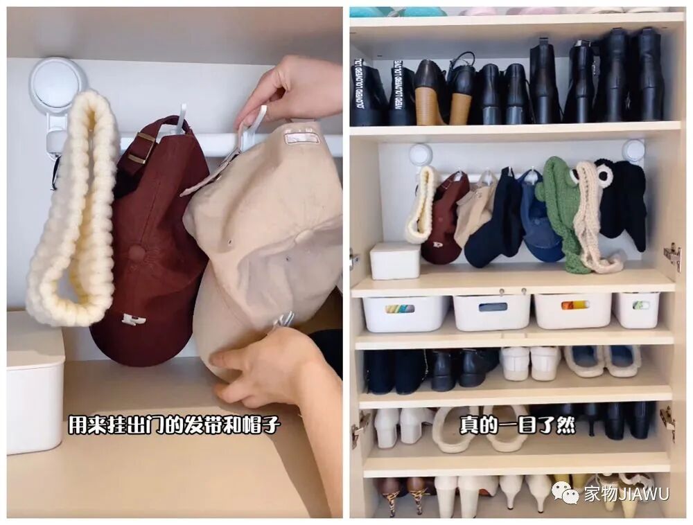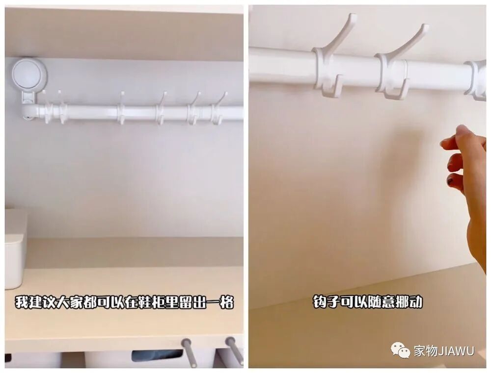 如果想要充分利用鞋柜、玄关柜内部的纵向空间,完全可以试试这种挂钩,利用吸盘或粘贴的方式将它安装到柜内,调整它上面的挂钩,就可以实现各种收纳需求了。