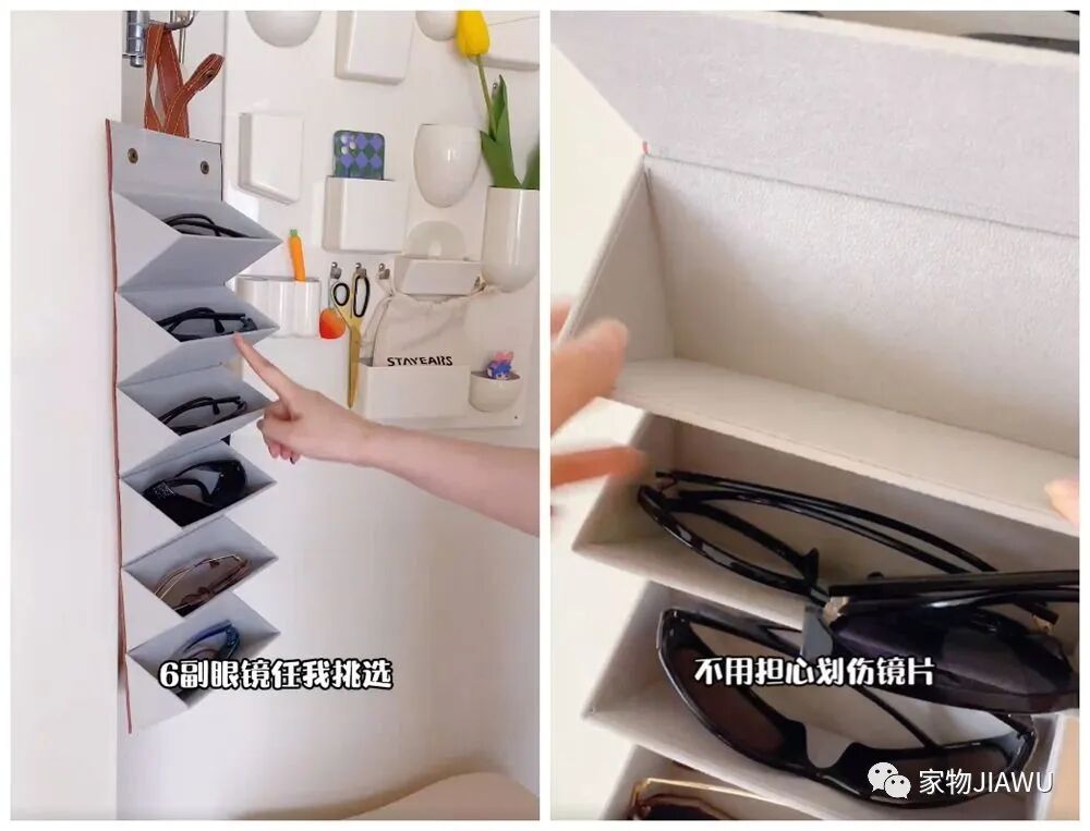 使用的时候,把它展开放在玄关,收纳平日里戴的眼镜、墨镜都非常合适,里面是那种绒布的材质,不用担心它会划伤镜面,实用性还是非常不错的。