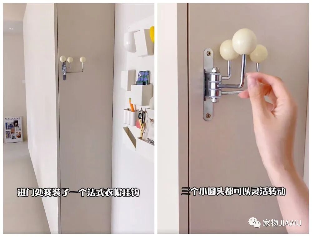 这个小小的挂钩共有三个挂头,看起来简单又精致,安装在柜子侧面、墙面上有些不起眼,但三个挂头能灵活移动的设计,却又让它变得实用了许多。