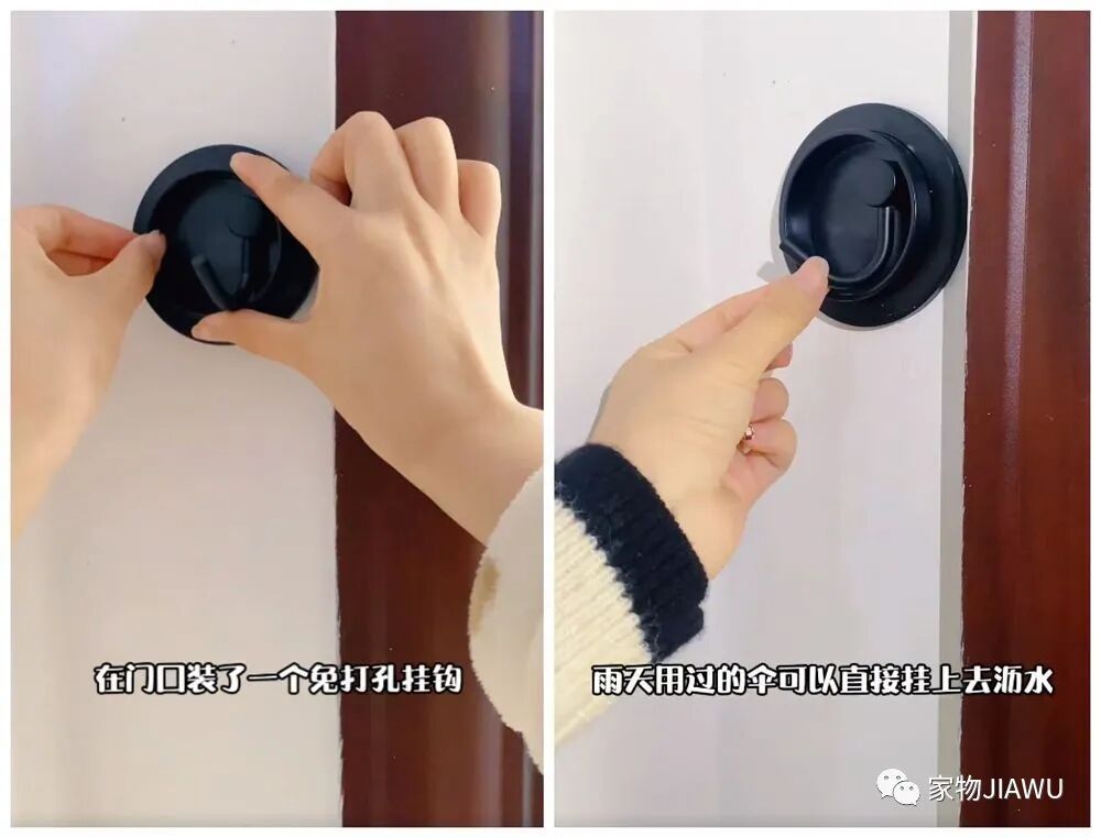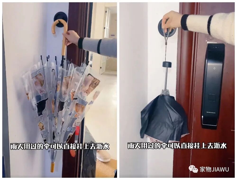 一些湿漉漉的雨伞,也可以挂在上面沥水,不用的时候还可以将钩子隐藏收纳在其“托盘”内,不会显得突兀,设计还是比较贴心哒~