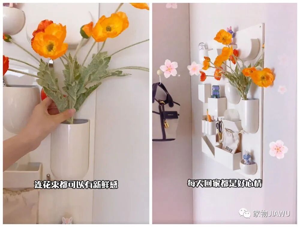 其次,它的内部不仅设有放置钥匙、摆件的格子,更是自带一个小小的花瓶,平日里买些花花草草插在玄关里,感觉一进门就是生机盎然呢~