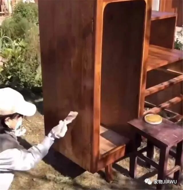 首先,姑娘买来了除漆剂,打算将柜子上老旧的漆面全部去除,重新上漆。