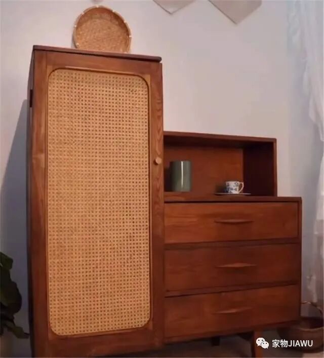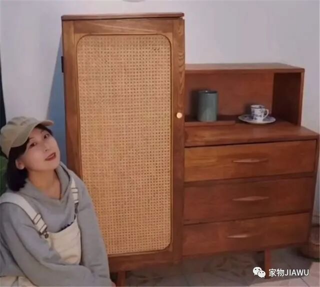 柜门上的木纹、铜制小把手、藤编柜门,都成为了这组柜子的点睛之笔,把它当做玄关柜、杂物柜、餐边柜都很合适,不得不让人佩服这位姑娘的手艺!
