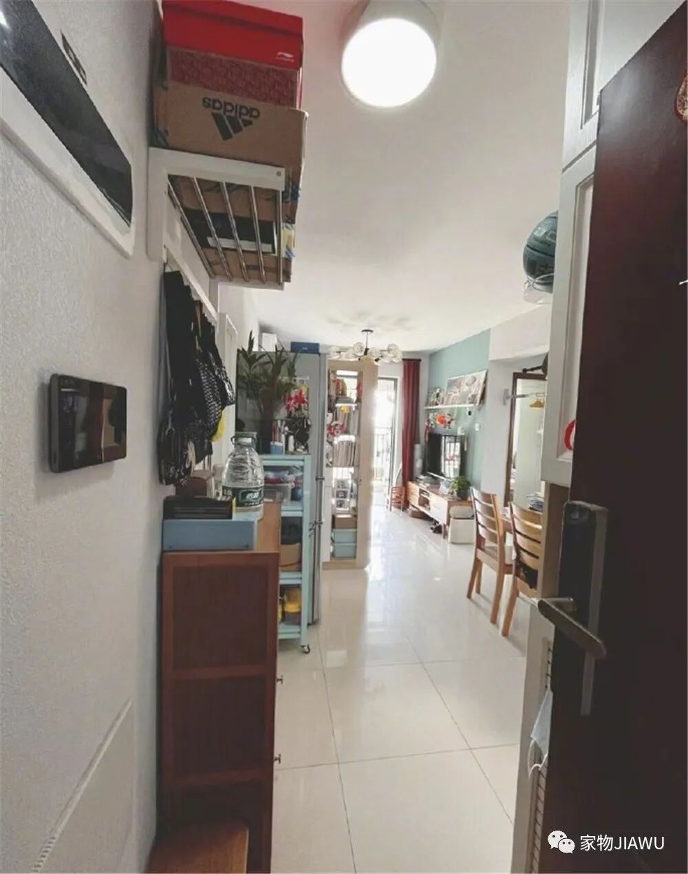 当然,一进门的玄关空间也很狭窄,但还是做了换鞋凳、鞋柜和通顶式的衣柜,方便进出家门随手收纳各种物品,同时挂置衣物、放置鞋袜。