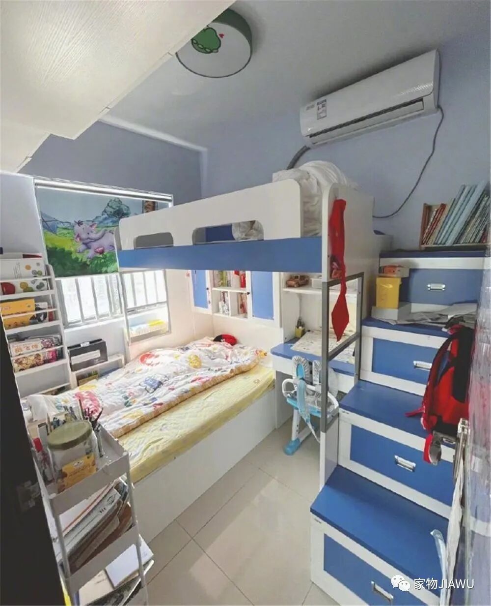 儿童房则显得相对宽松一些,用一体式上下铺的榻榻米,打造出集收纳、睡眠、书写于一体的儿童生活区,将横向和纵向空间都完美利用了起来,还是很不错的~