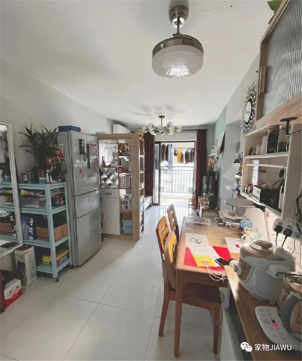 旁边的腰身柜,则承担了餐边柜的功能;椅子后面,也有包括冰箱在内的一组组收纳架,虽然东西繁多,但收纳还算有序。