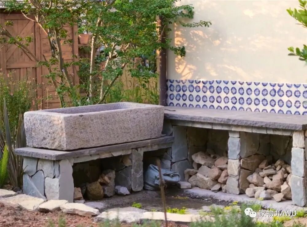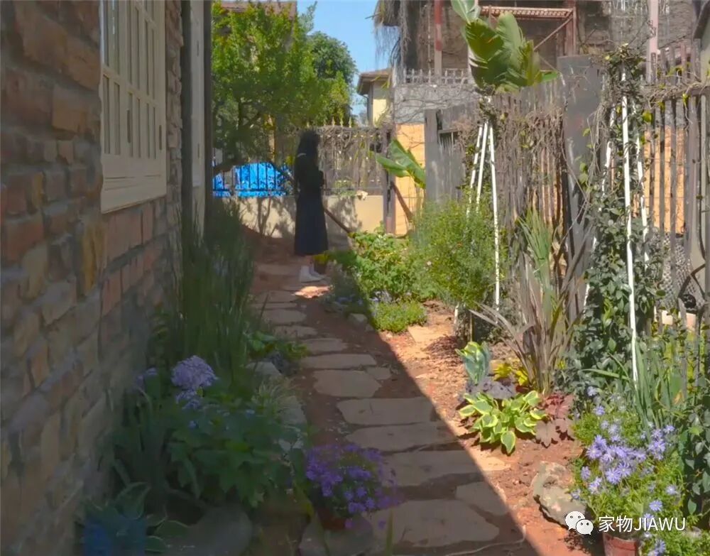 一部分的墙面也依照这种风格进行铺贴,遮挡住了原本看上去脏兮兮的水泥墙,给小院增添了几分独特的浪漫质感。