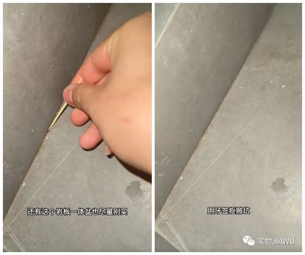 这种所谓的“岩板一体式”水槽盆,也真的不建议大家买,说是一体式的设计,其实边边角角中很多的缝隙,清理起来简直不要太麻烦!只能用牙签或者其他细小的东西一点点抠,用过就知道有多糟心了……