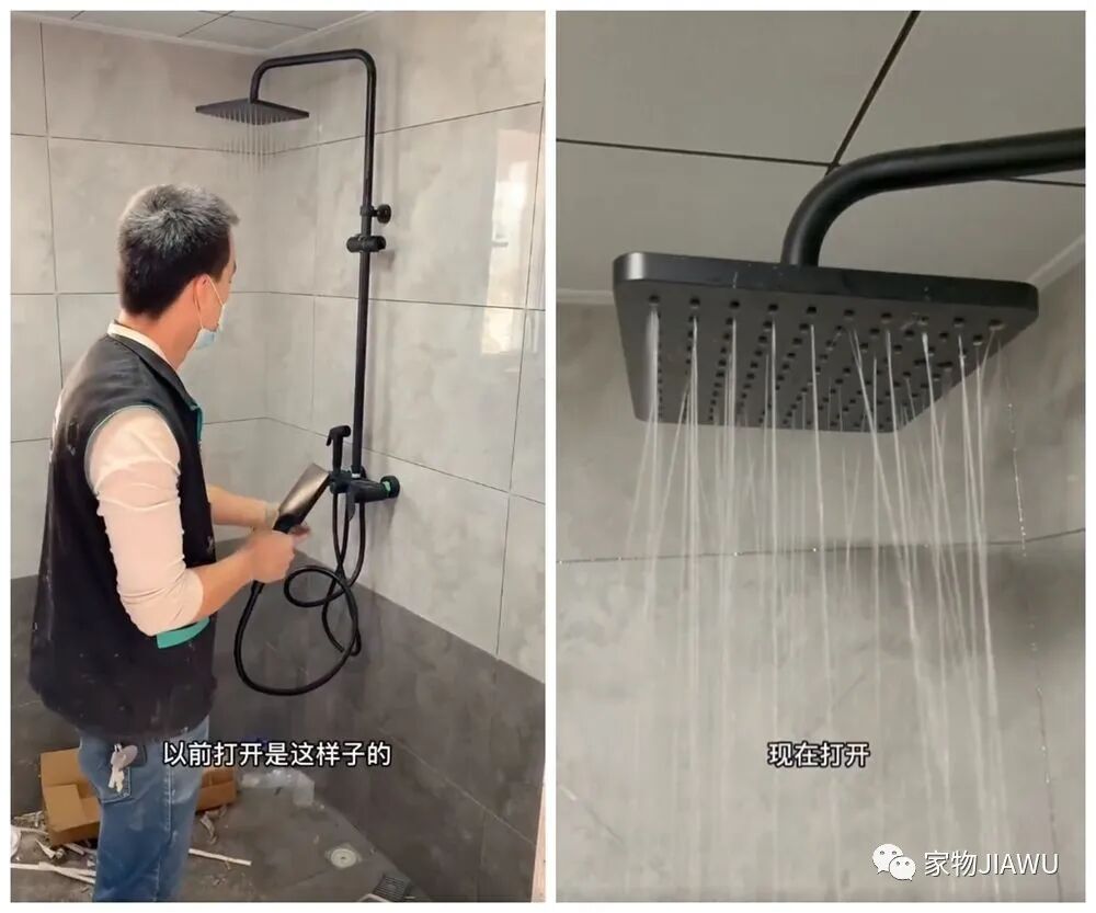 之前流行了一阵子黑色的花洒,但实际上黑色的花洒真的是中看不中用,用久了的话,花洒会积聚上一层白色的水垢和沐浴液、洗发露的残留,很难擦洗掉,又不能用钢丝刷,真不建议大家做。