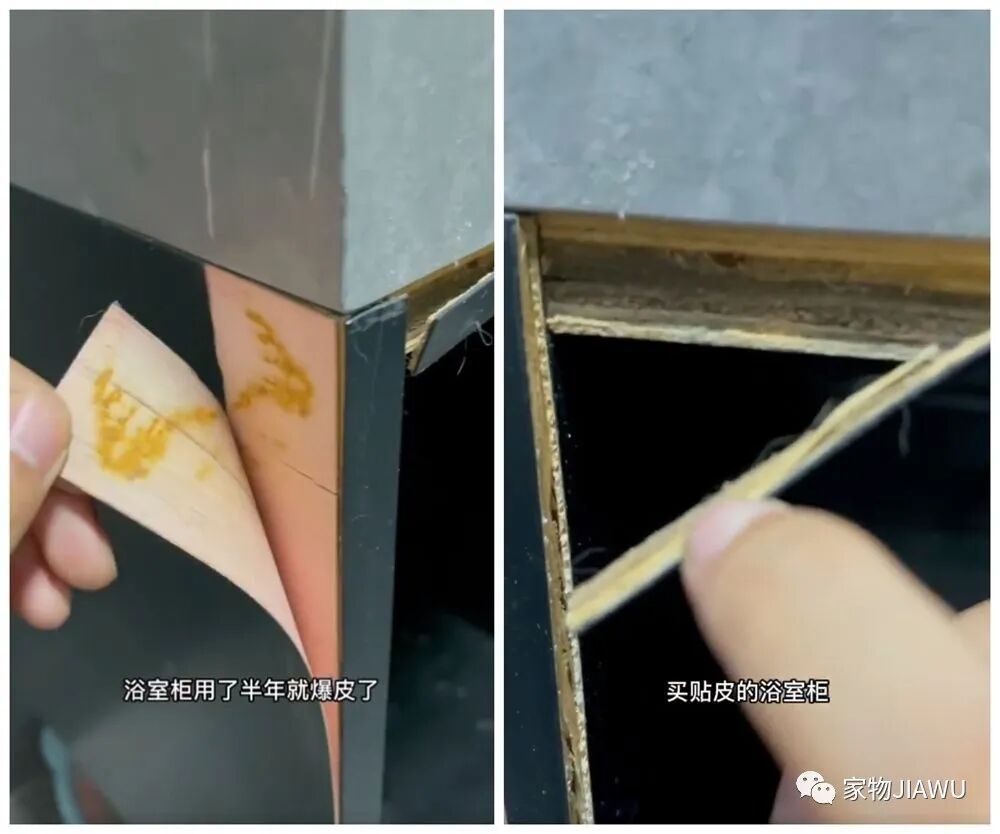 当时图便宜,买的贴皮的浴室柜,看着外观挺漂亮,价格也很美丽,觉得自己捡了个大便宜,没想到用了差不多半年左右,直接出现了爆皮和起鼓的问题,再想改的话,真的很费事儿。