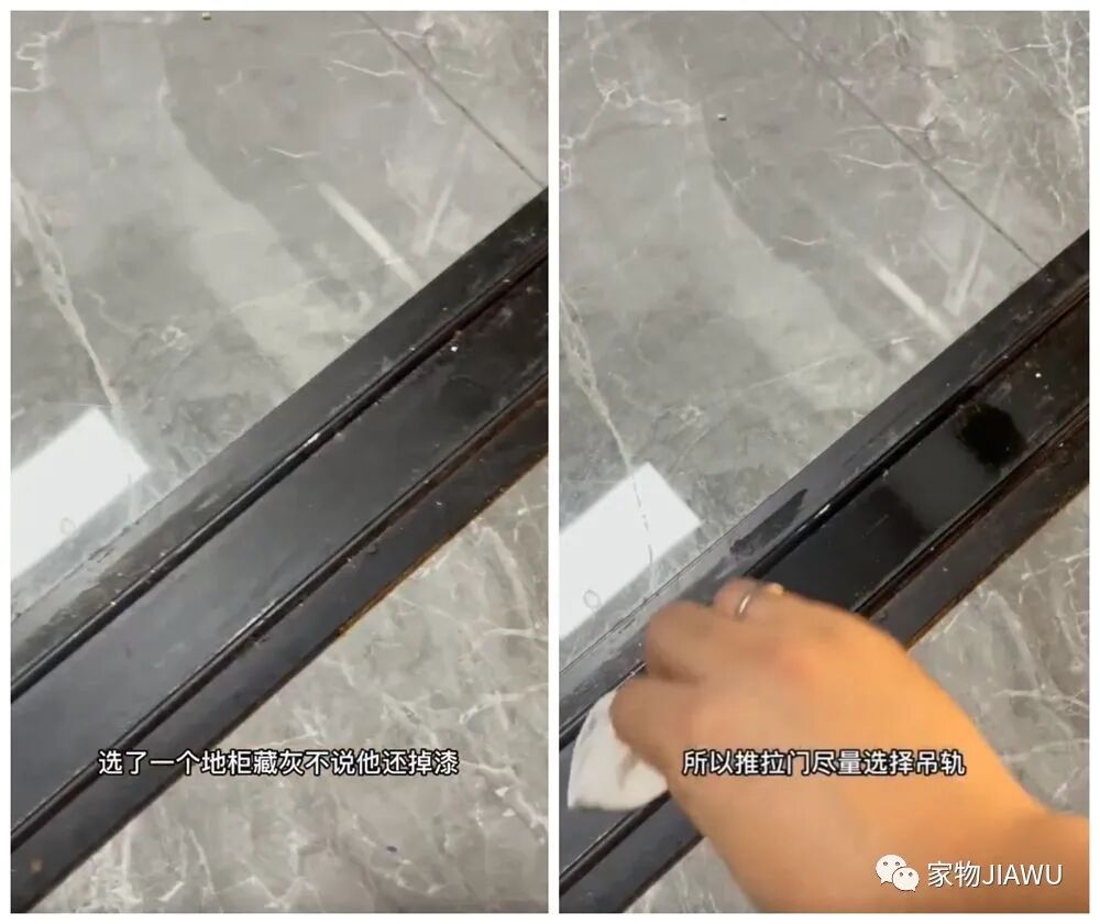 厨房的推拉门选了地轨,这种地轨的推拉门确实是太容易脏了,尤其是黑色的,即便做了这种外凸式的也不行,还是更建议大家做吊轨,当然,实在不行也尽量别做黑色的……