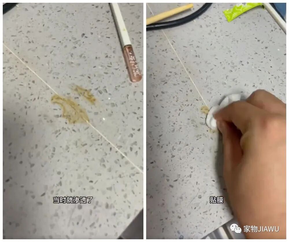 厨房这种人造石的台面,很容易渗入水渍和油污,哦对,包括一些窗台也是如此。