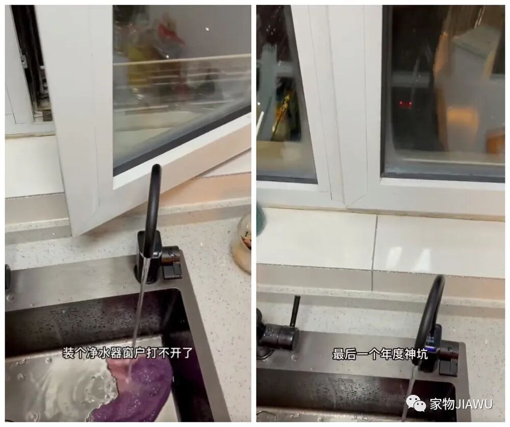 最后,就是家里净水器的位置了,真的有够尴尬!本来厨房设计得好好的,但安装净水器后,窗户就没法完全打开了,这算之前预留空间的失误……