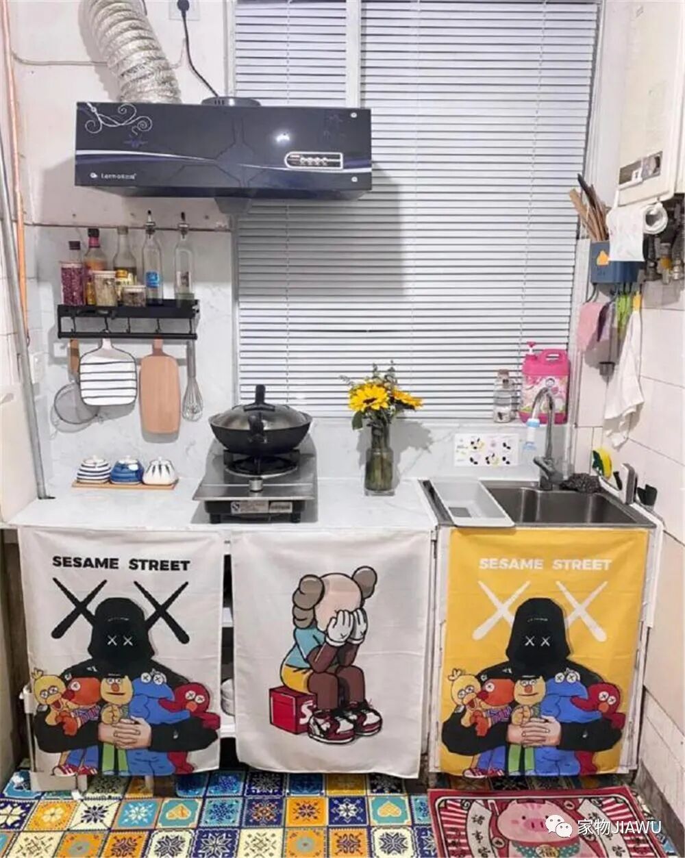 家里的厨房和卫生间,空间相对来说就要小很多了,但为了做得有贴点一些,两人还是简单对它进行了一番装饰,尤其是厨房,看起来色彩丰富,又潮又酷!