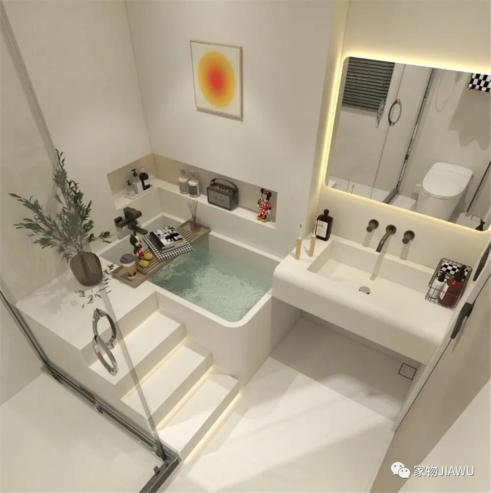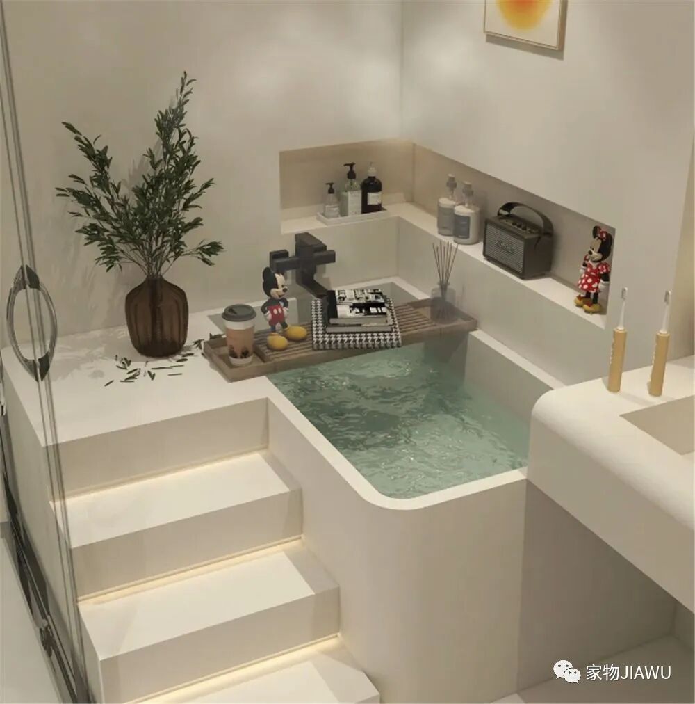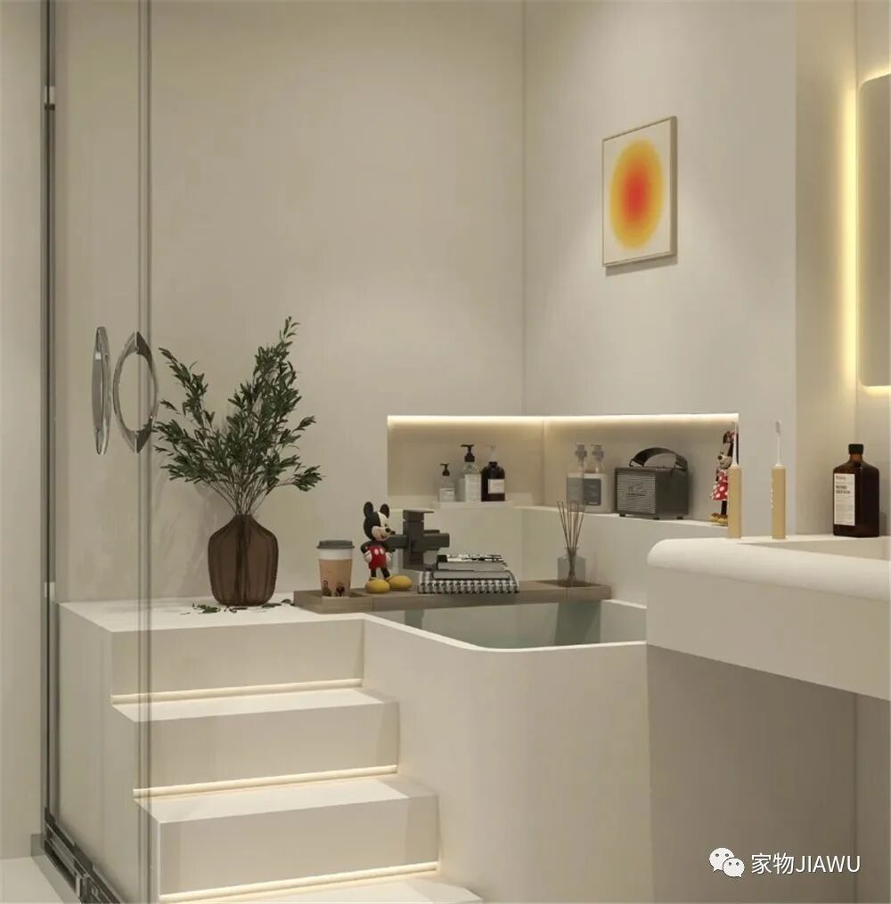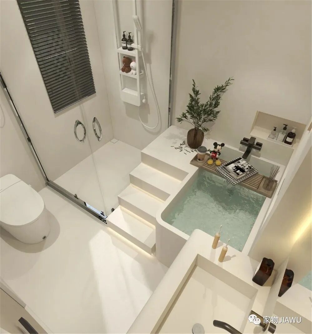 比起直接迈进浴缸来说,这种增加台阶的方式显得更有仪式感,也更加方便,同时,台阶也可以当做坐浴区和置物区,起到装饰和实用性两不误的效果。