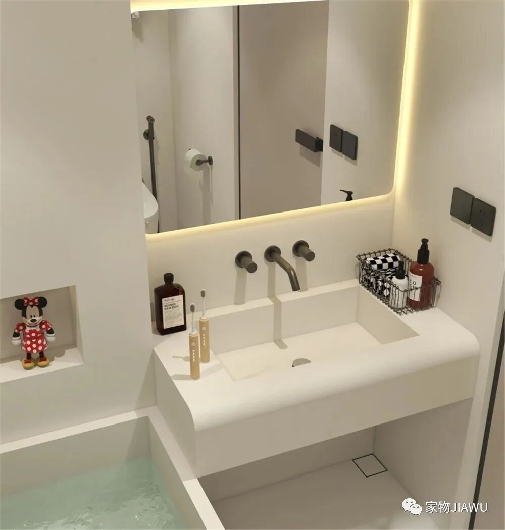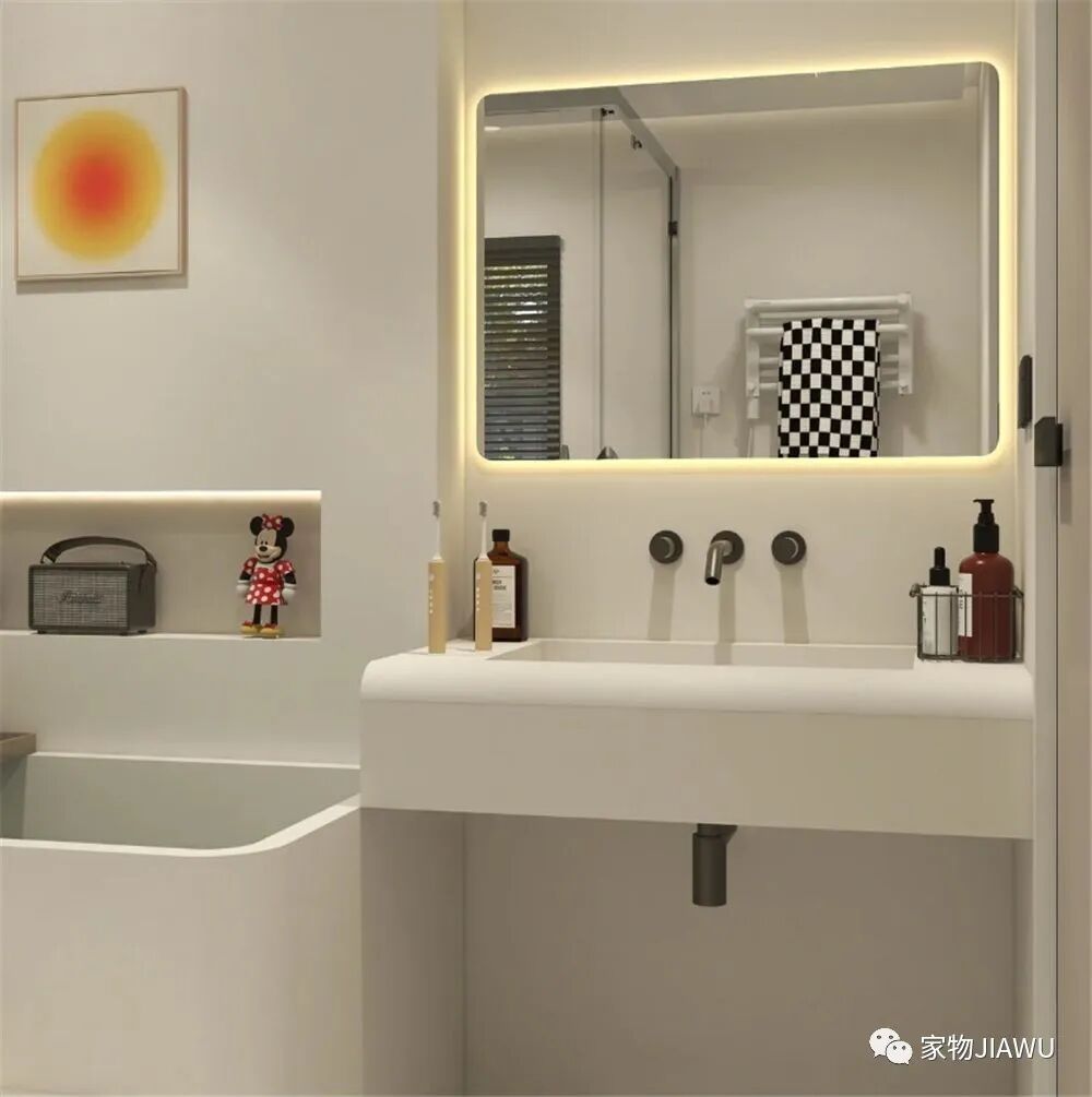 为了视觉效果考虑,浴室的镜子也放弃了做镜柜的打算,而是用这种带有背光的防雾镜代替,姑娘只好进行了一波断舍离,尽量减少自己所用的洗漱用品,将剩下的护肤、洗漱用品收纳在角落的篮子里。