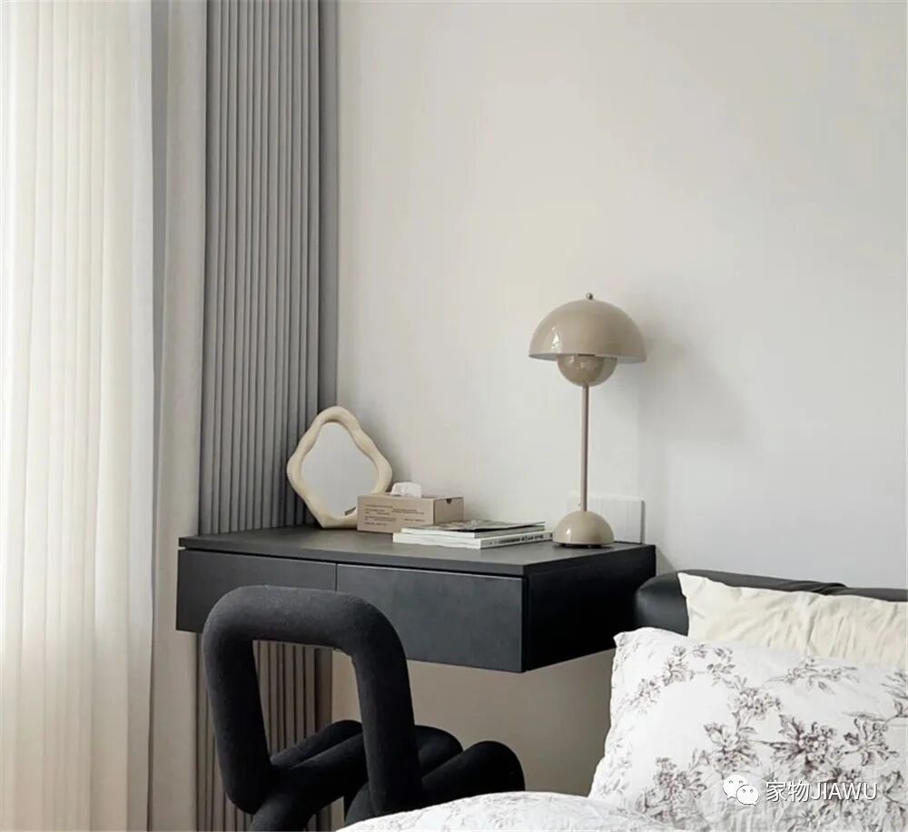 在床边,可爱的悬浮式梳妆台搭配一把造型奇特的椅子,也给室内带来了几分生机与活力。
