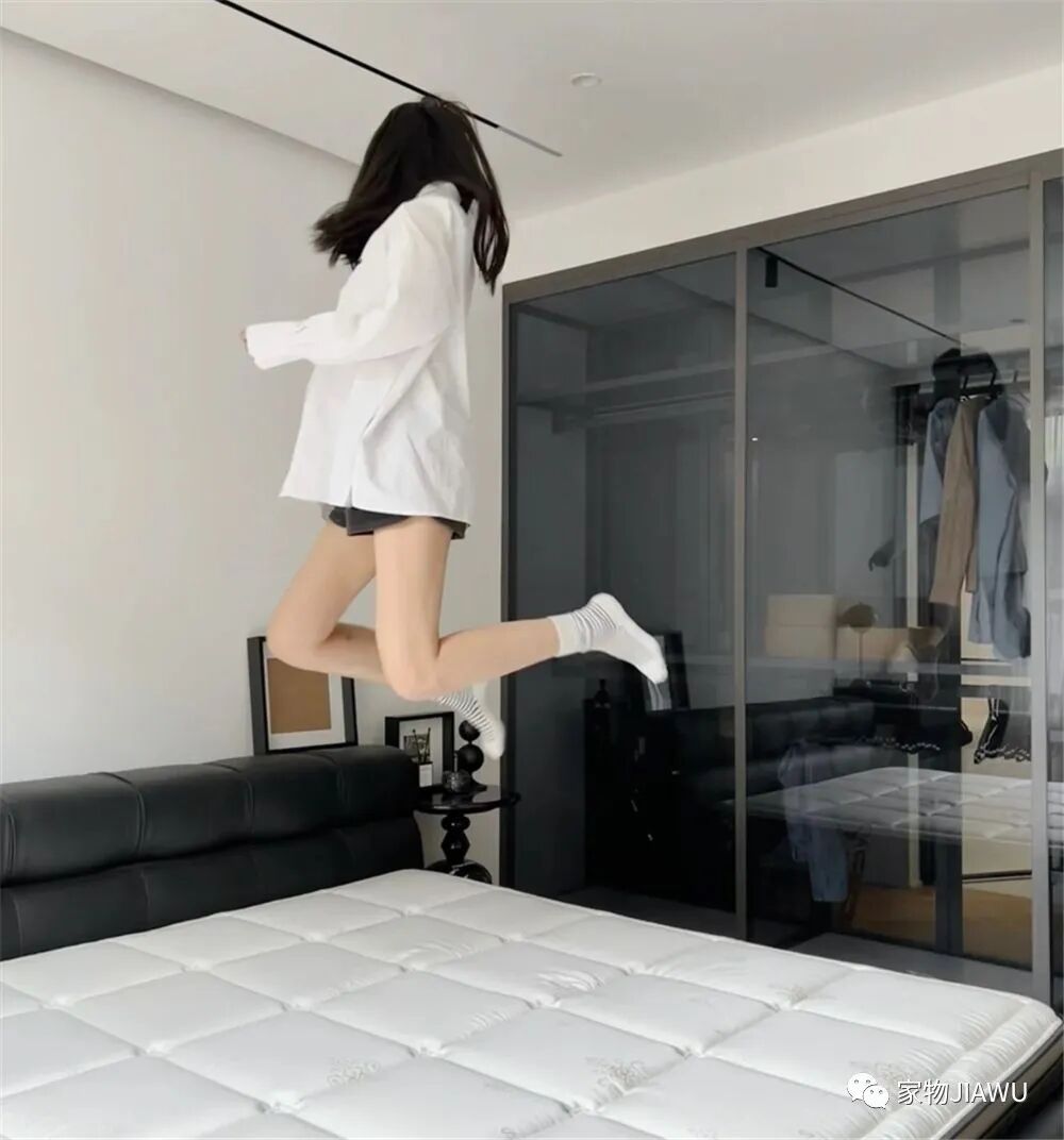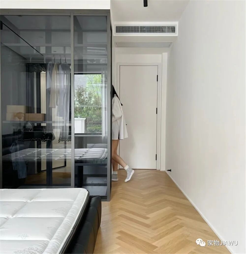 而衣柜则选用了深色的玻璃衣柜,我个人是不太建议用这种衣柜的,毕竟衣服太多以后,衣柜内会显得十分杂乱,但好在这对小夫妻都比较勤快,会时不时地收拾整理。