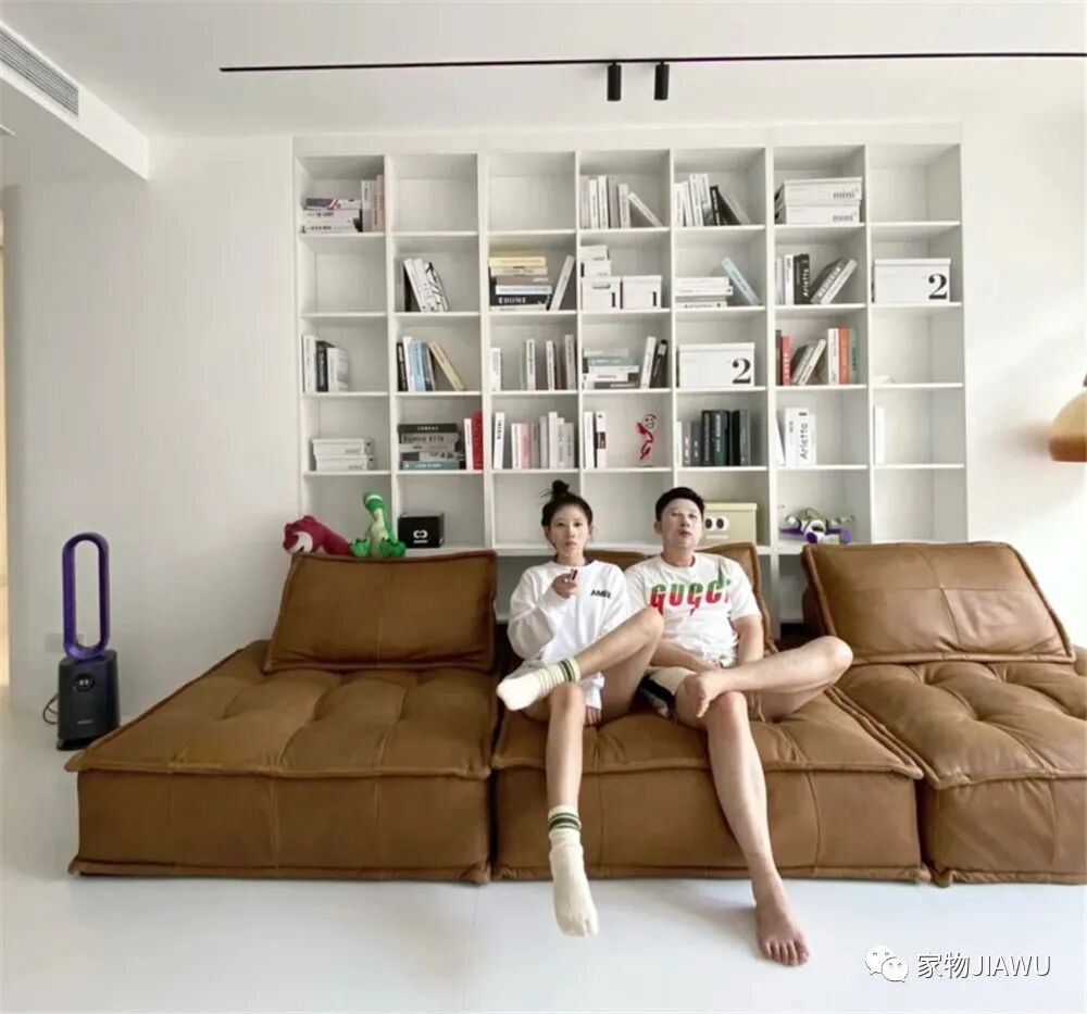 夫妻俩对这间客厅超级满意,一张超深坐深的沙发、一面当做书架的开放式背景墙,组成了这处沙发休闲区,这里可坐可躺,下班回家往沙发上一瘫,别提多舒服了!
