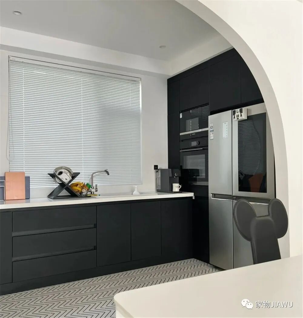 厨房内,橱柜一改白色,变成了深色系的设计,既给整个空间带来了视觉落点,同时也更加耐脏。