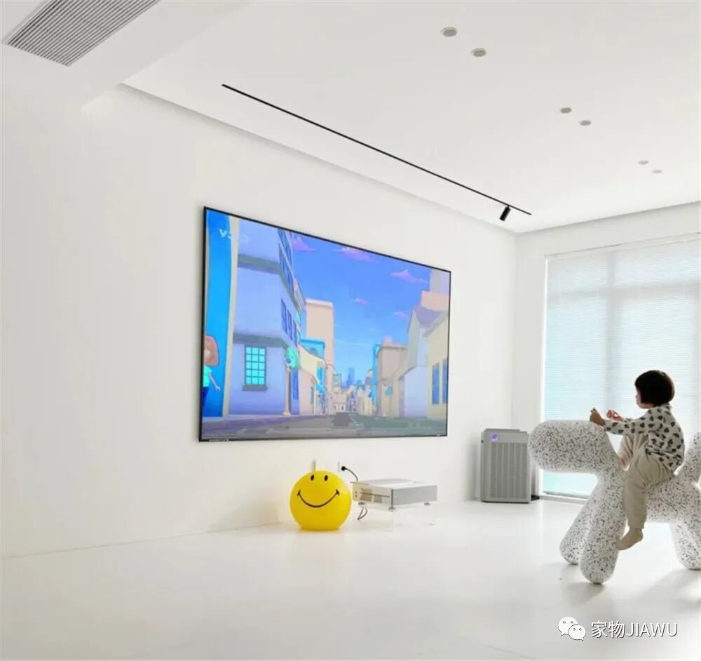 而对面的电视墙,则选了比较贵的“激光电视”,中间没有安装茶几,电视墙也没有摆放电视柜,只是用一个透明的小台子放置机器,纯白色的一面大墙,看上去就宽敞气派。