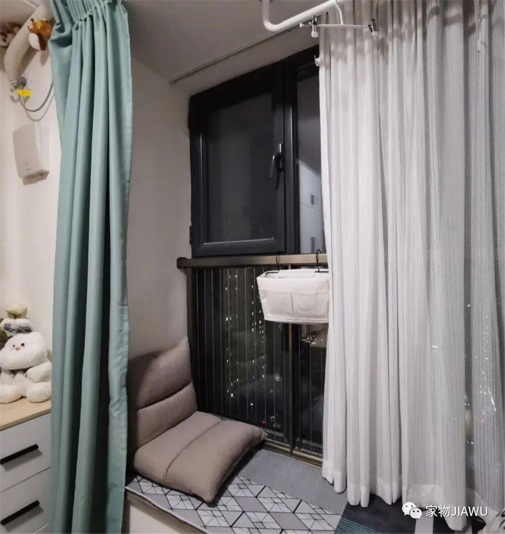 蜗居的尽头,是家里的一张小书桌和侧边飘窗,为了遮挡桌面下杂乱的线材,她特意用帘子遮挡住了桌下空间,只有需要用的时候才会掀开,小细节做得很不错。