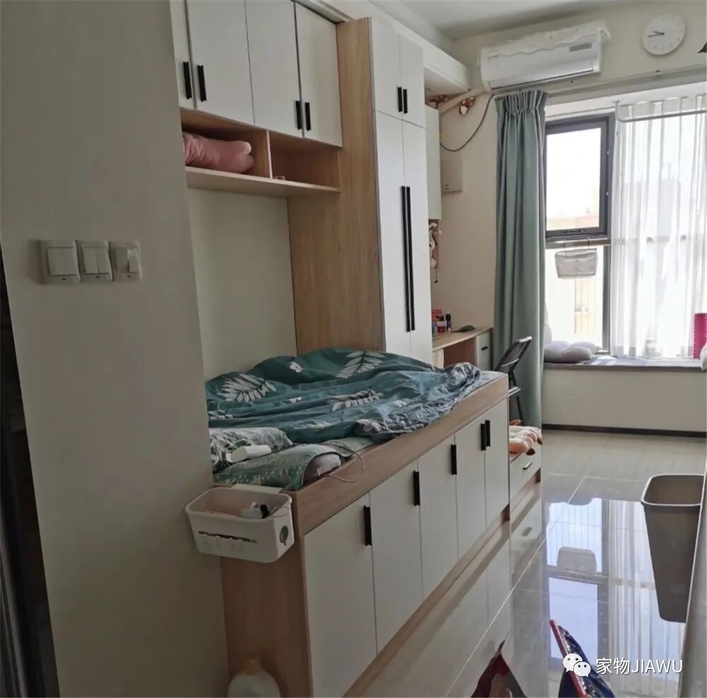 就像我前面说的,厨房的正对面就是家里的卧室区域,这里做成了“柜床一体化”的设计,将床板放在底部的矮柜上,旁边与衣柜相连接,恰好利用起了这片空间。