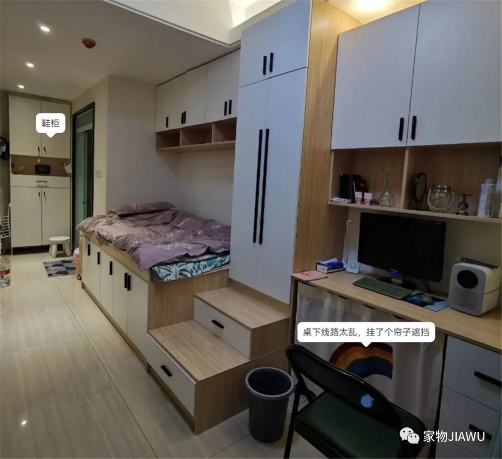 而就连迈上床的楼梯、床铺上方的吊柜,也都做了收纳抽屉和柜格,可以说是半平米都不浪费,真的是非常到位了!