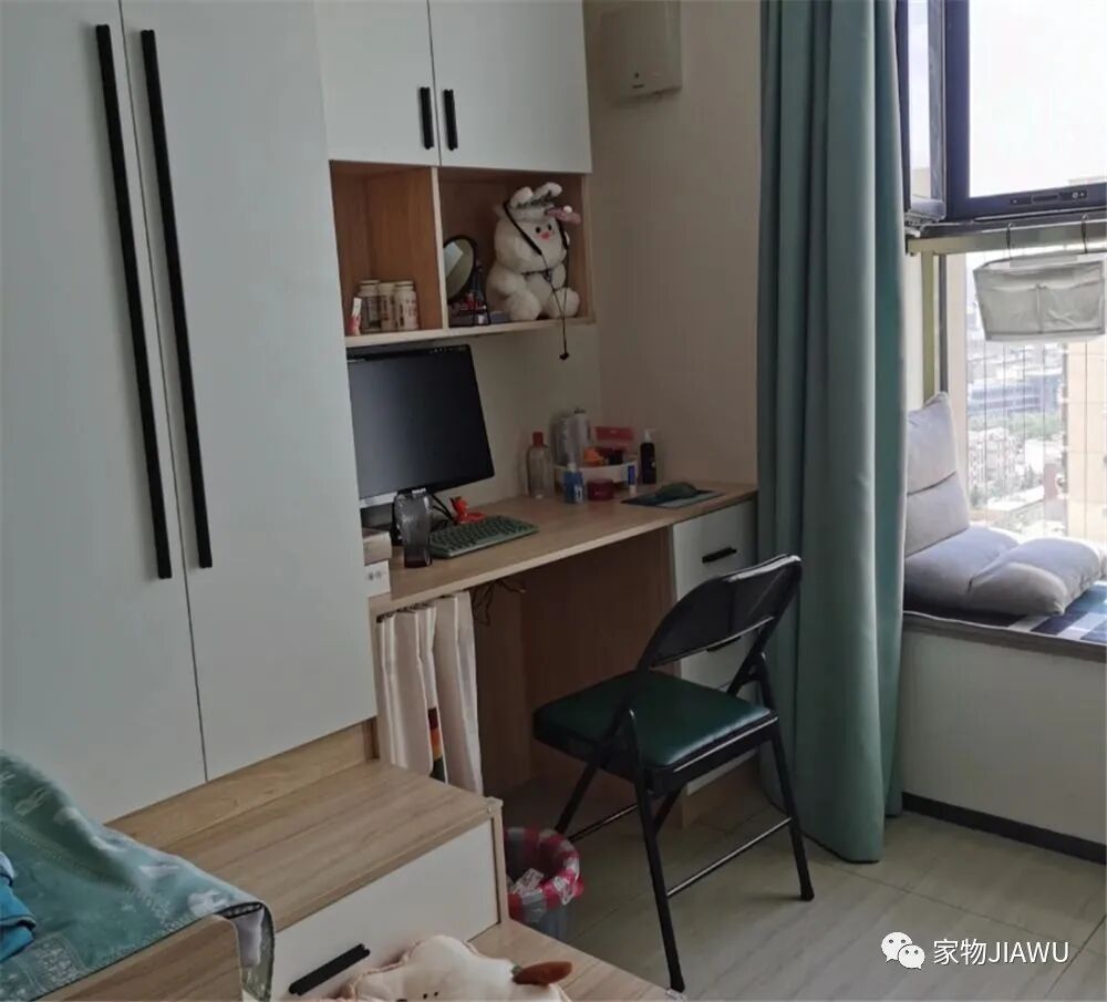 最里端还有一个休闲的飘窗以及办公的工作桌,别看这18㎡空间很小,该有的功能可以说是一个也不少了!