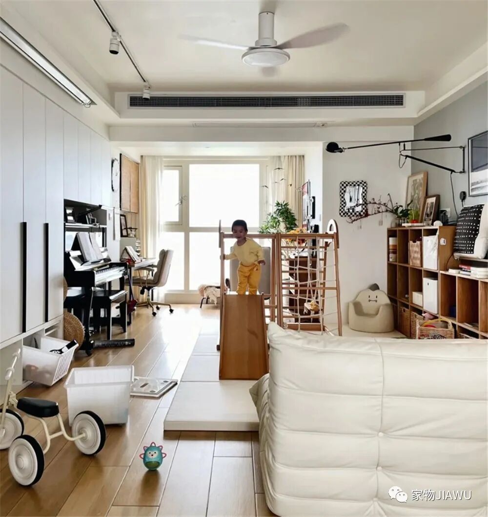 除了儿童房以外,家里还有给孩子专门准备的娱乐空间,就放在了书房内,这里不仅有小三轮车、玩具箱、绘本架,甚至还有一组简易的滑梯和秋千,这“待遇”也是没谁了!