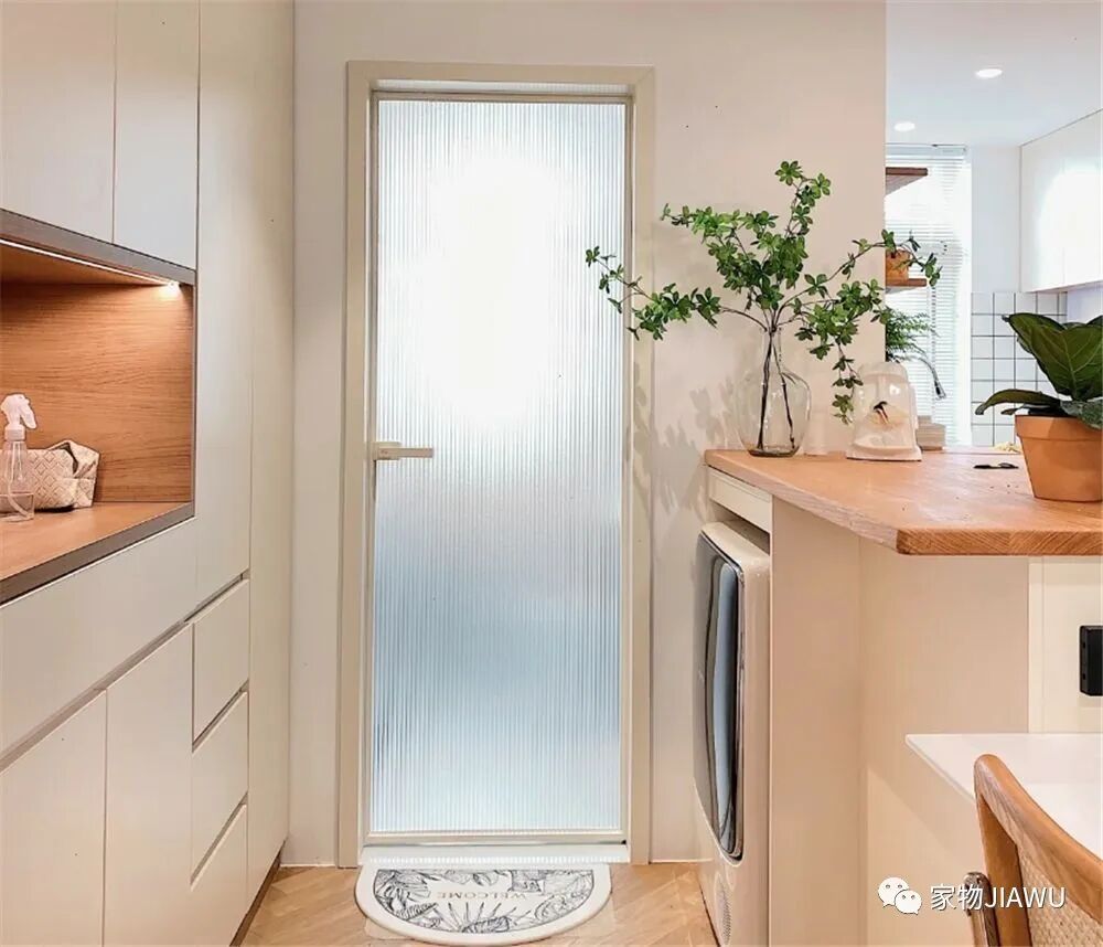 旁边的洗衣机也是刚好嵌入墙面中,既填补了空间,又不会影响到开门。