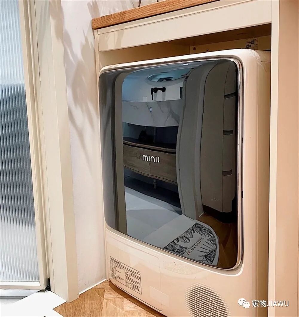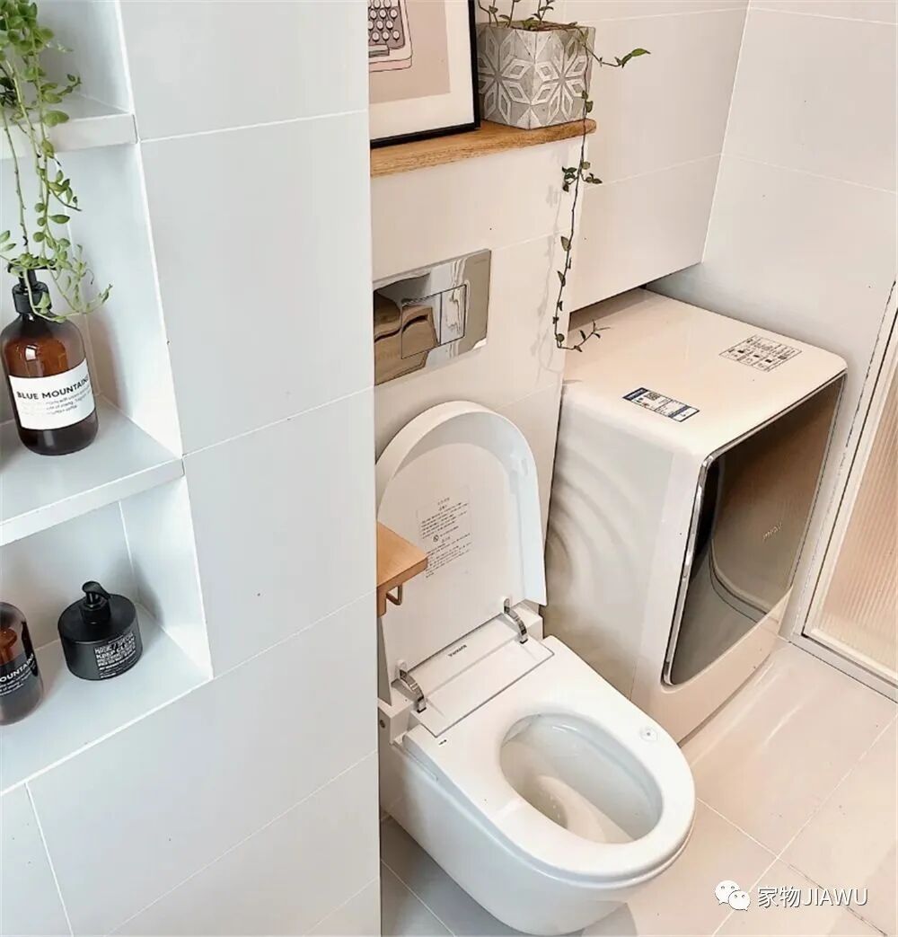 其实,这位姑娘是将洗衣机和和烘干机,分别置于了卫生间内外,仅有一墙之隔~空间布置还是挺有趣的。
